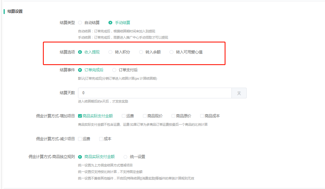 结算天数:设置了天数,当订单完成后满足设置的天数后,前端佣金才能申请提现