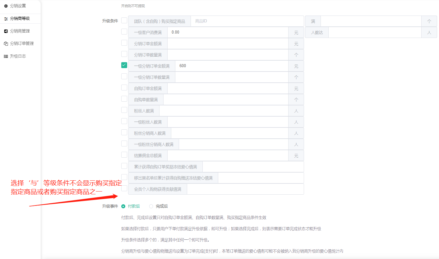 [与]满足所有条件才可以升级(ps:其中下级粉丝人数和下级分销商人数是上级分销商的升级依据,并隐藏[购买指定商品][购买指定商品之一]升级方式)