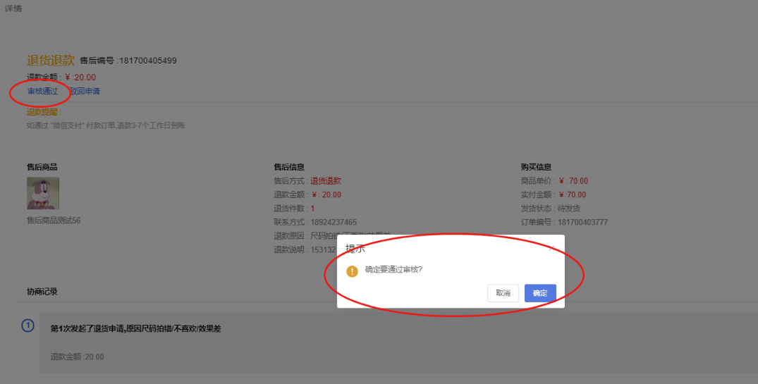 4.进入详情可查看退款信息,可操审核通过退款申请,或者驳回(驳回用户可以重新申请退款)