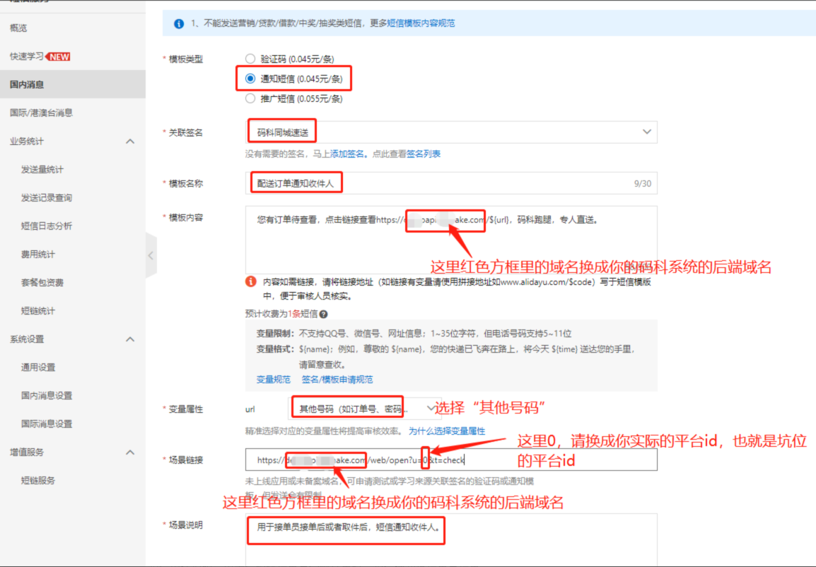 模板内容示例:您有订单待查看,点击链接查看https://你的码科系统后端域名/${url},码科跑腿,专人直送。