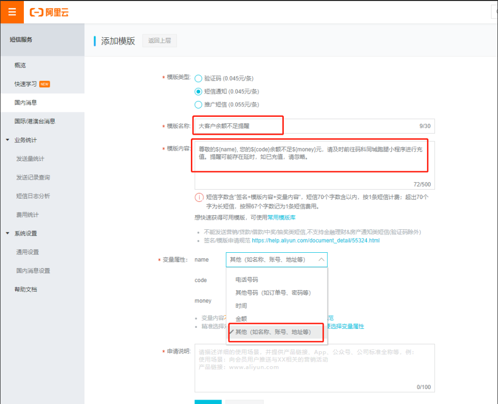 模板内容示例:尊敬的${name}, 您的${code}余额不足${money}元,请及时前往XXX小程序进行充值。提醒可能存在延时,如已充值,请忽略。
