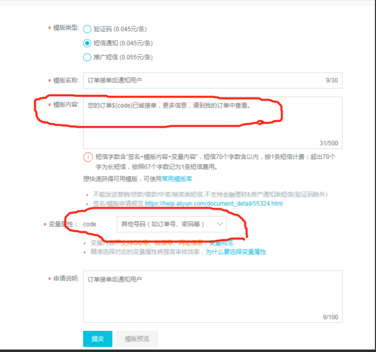 模板内容示例:您的订单${code}已取消,请到我的订单中查看!