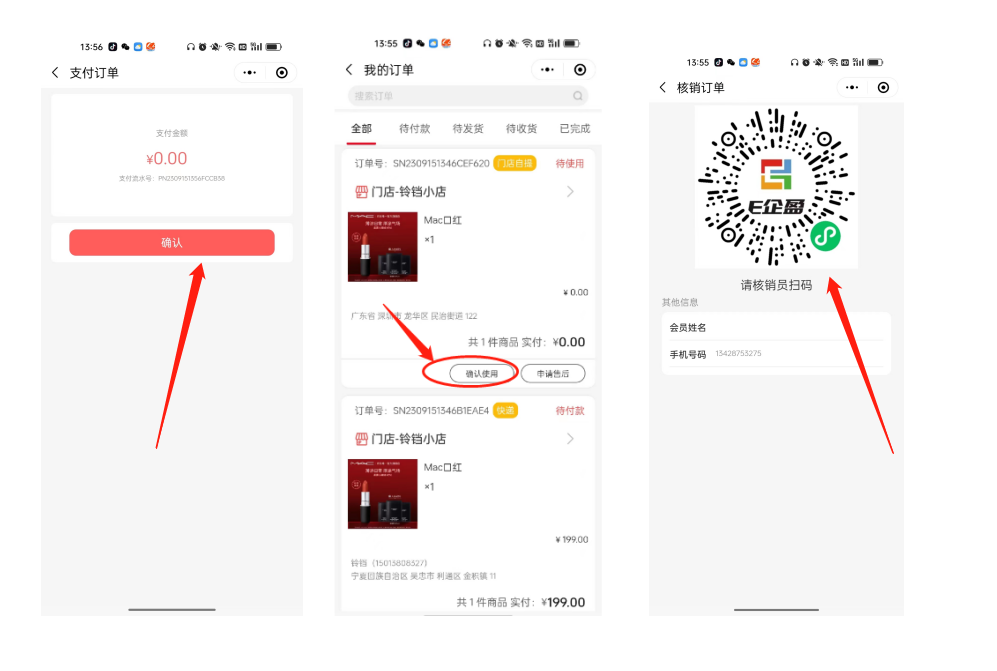 3.支付后,用户去订单里面找到该订单,到门店后点击确认使用,门店的核销员用微信扫一扫这个核销码即可进行核销。