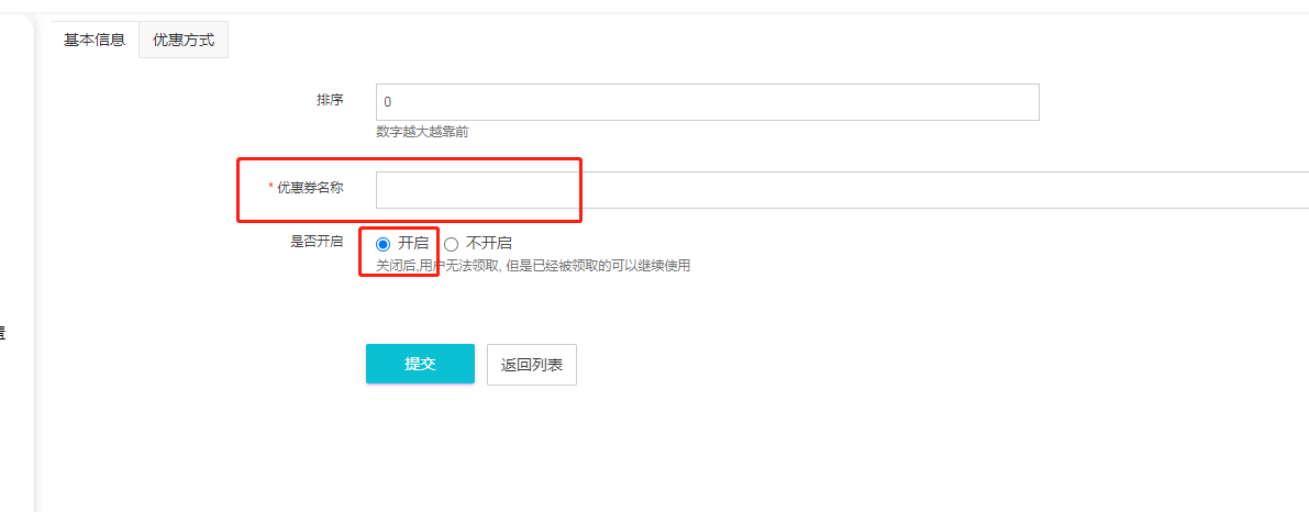 2.点击添加优惠券,填写优惠券名称、开启优惠券