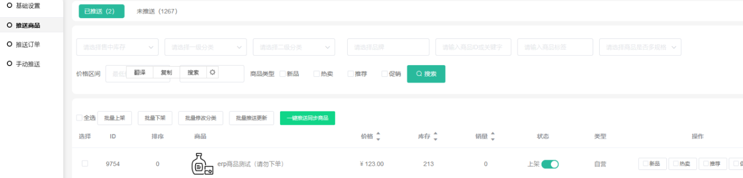 2、一键推送同步商品(把商城自营全部未推送的商品推送到第三方)