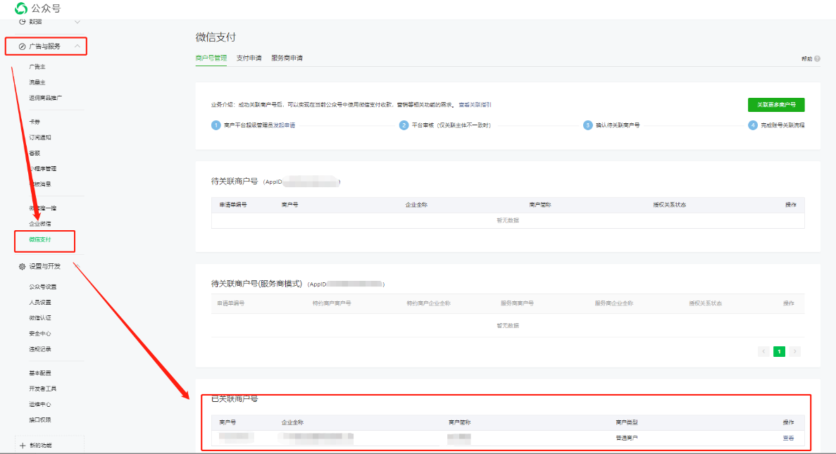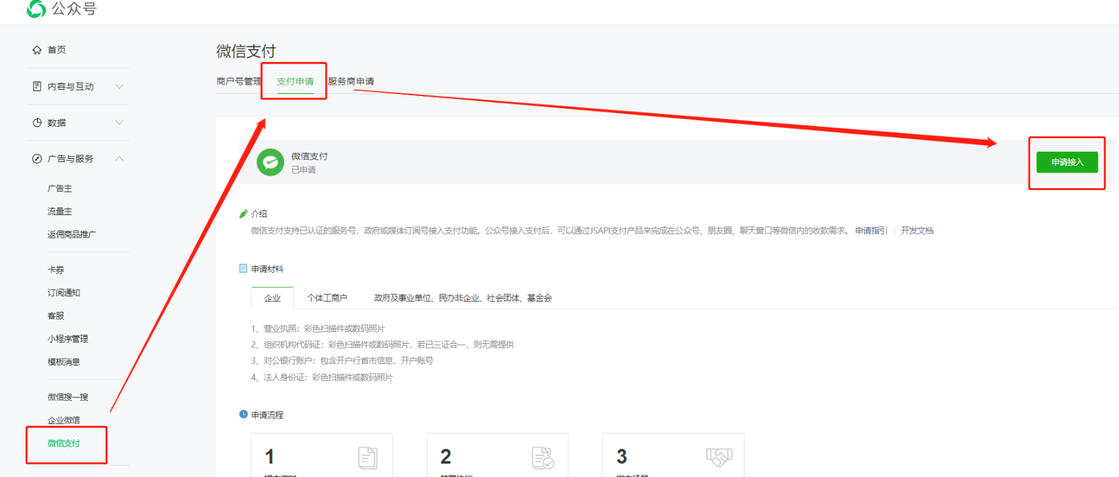 请登录公众平台mp.weixin.qq.com,开通微信支付。注:必须申请企业账户的微信支付;公众号和微信商户号建议同一个企业主体。