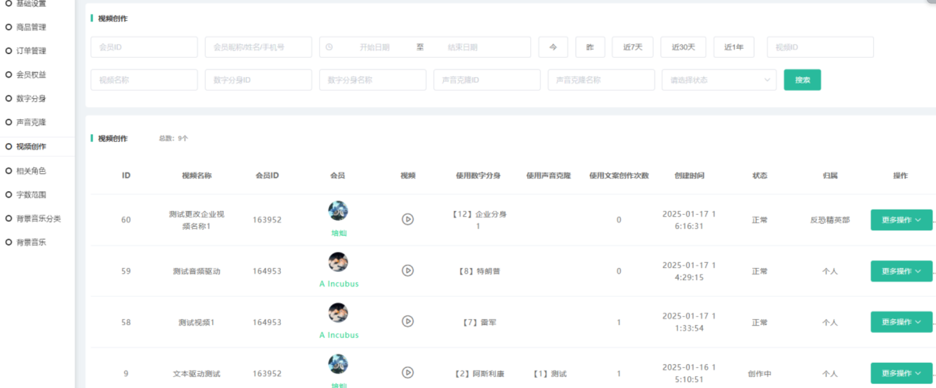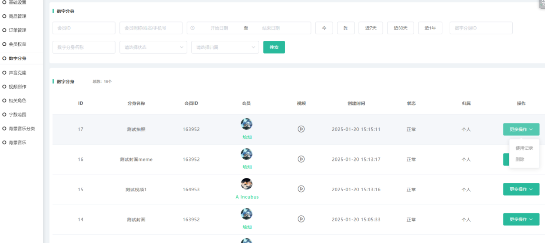 展示前端会员创建的数字分身,可进行查看视频,查看使用记录 删除操作
