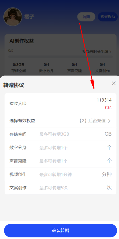 后台开启转赠功能时,可以讲当前拥有的权益转让给其他会员