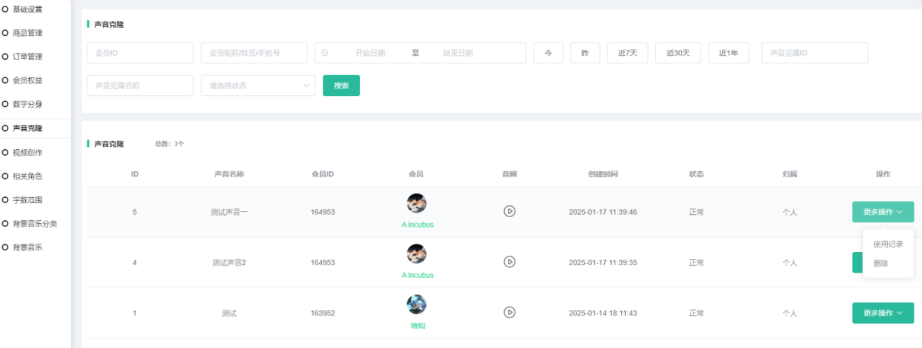 展示前端会员创建的声音克隆,可进行查看音频,查看使用记录 删除操作